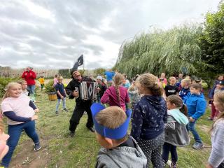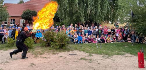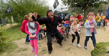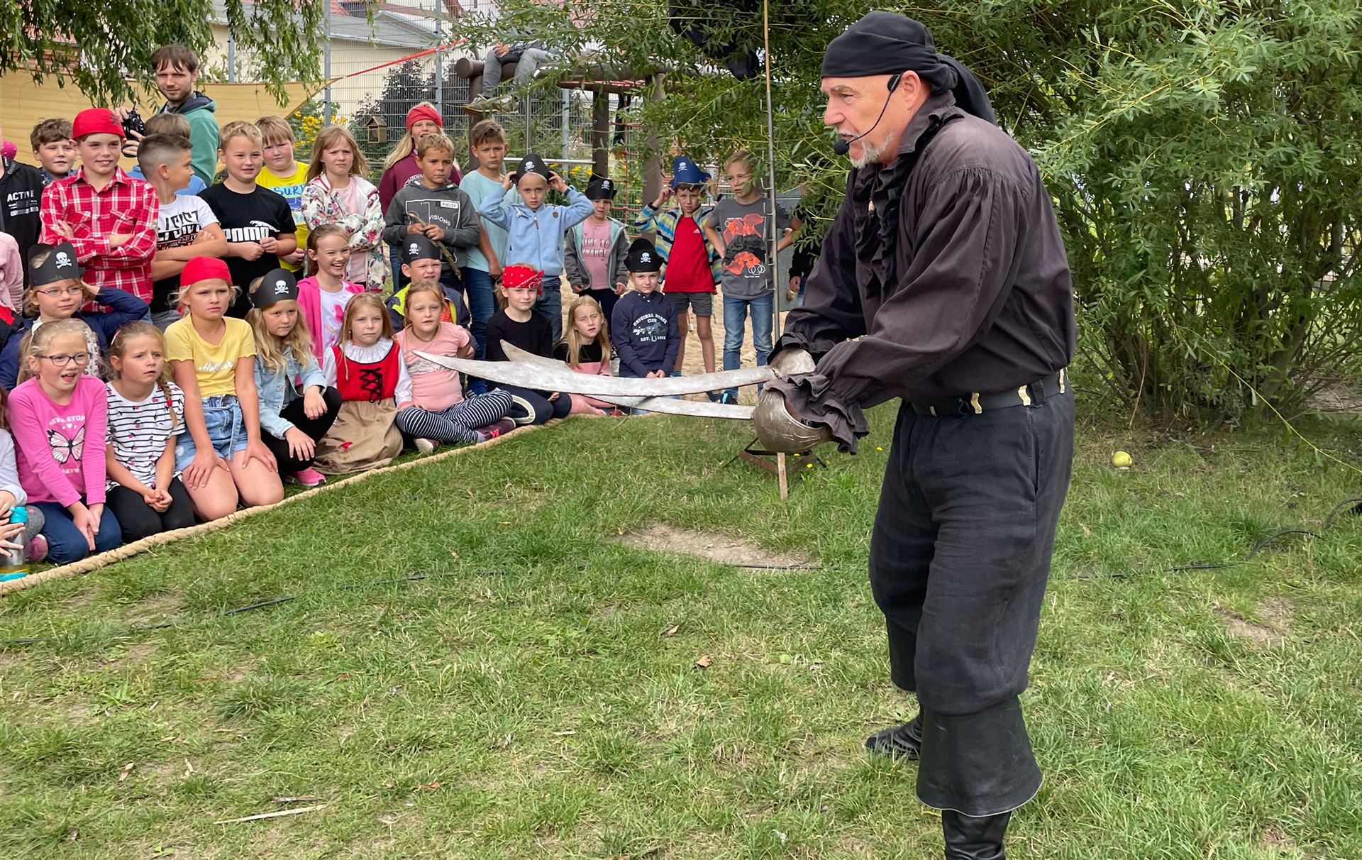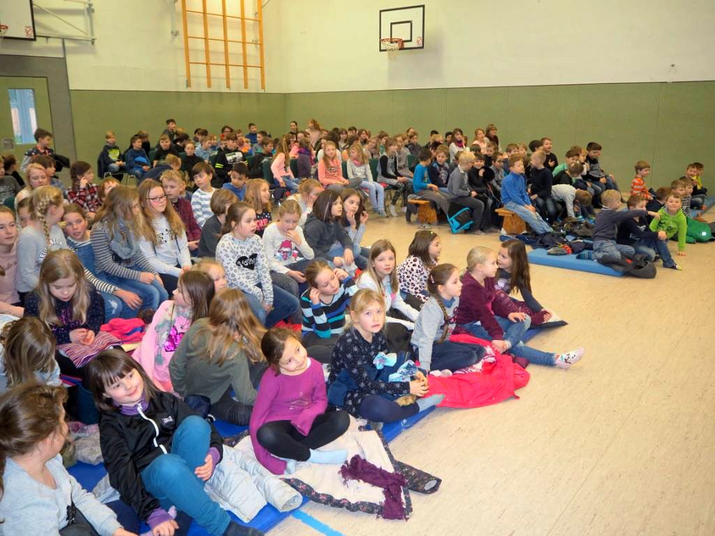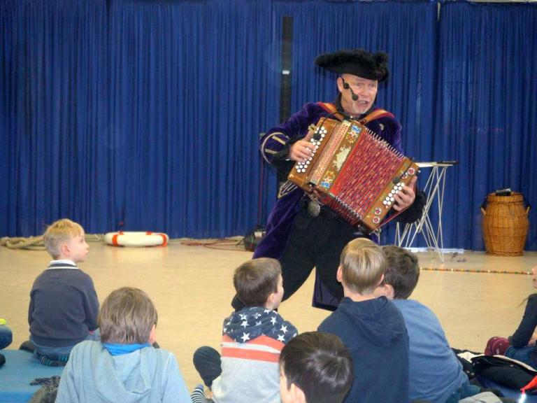 Die Klassen 1 - 5 lauschen gespannt der Geschichte des Piraten, der die Kinder mit vielen Künststücken begeistert.